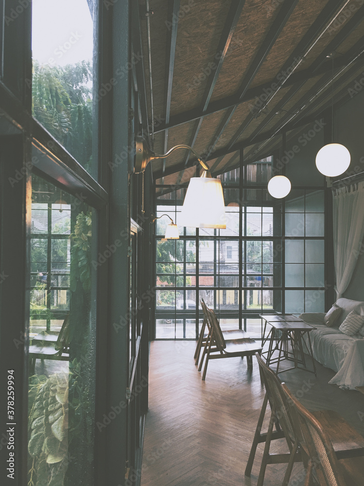 Interior restaurant cafe Transparent glass wall Toned