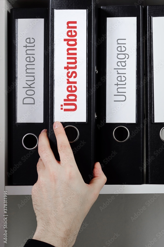 Überstunden. Ordner im Regal mit roter Beschriftung. Hand nimmt Dokumente aus Schrank im Büro