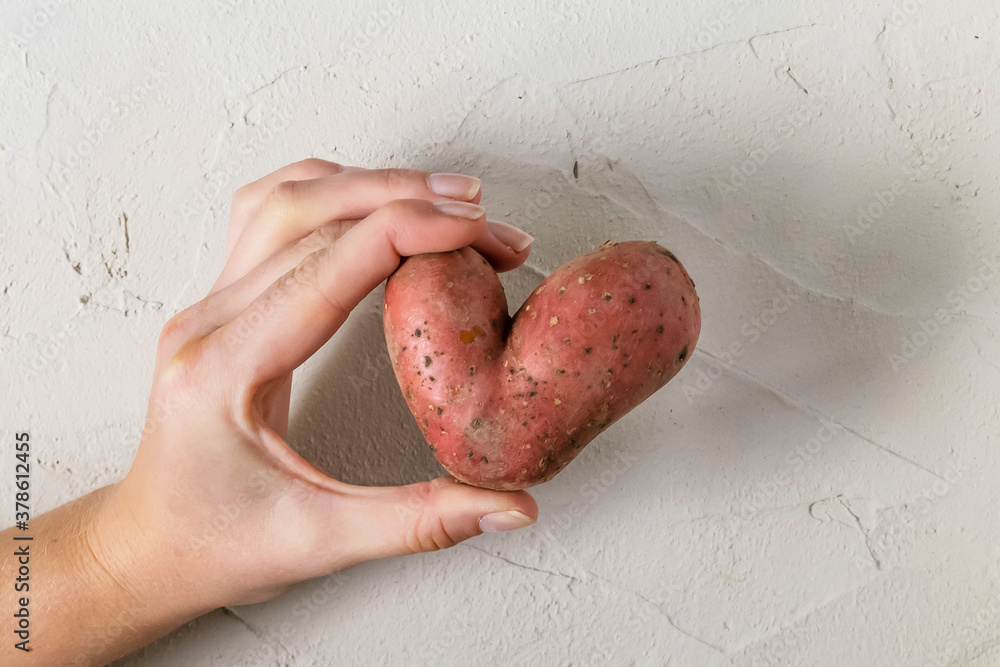 Ugly potato in the heart shape in hands on a gray concrete background. Funny, unnormal vegetable or food waste concept.