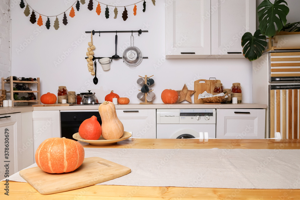 modern kitchen in light colors with autumn decor, orange pumpkins for Halloween, handmade garland on the wall, stylish furniture and dishes