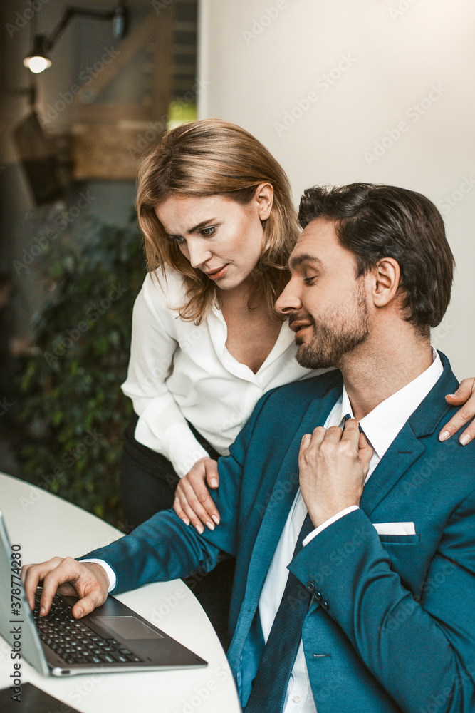 Girl in the office hugs a sitting colleague. Seducing a subordinate in the office concept. High quality photo.