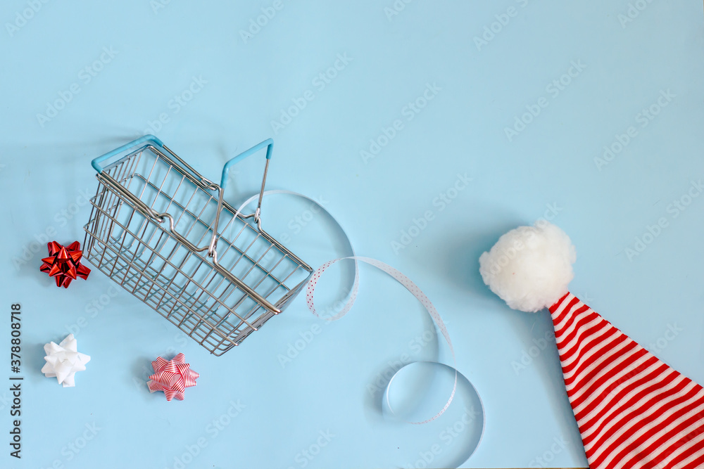 Christmas shopping flat lay. Christmas Santa hat in red and white stripes with brown elk antlers, next to metal shopping basket on a blue background , top view, copy space