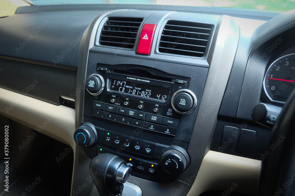 Close up image of car dashboard audio radio air conditioner console. Car audio player.