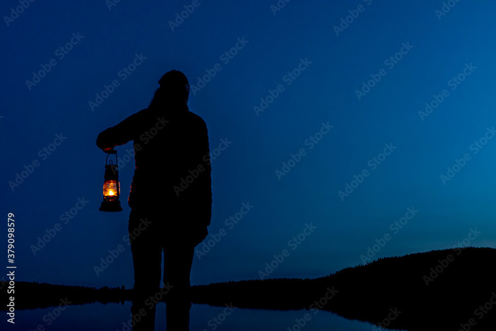 Silhouette of a woman looking into the last light of the day by a lake in the wild, holding a lit vintage kerosene lamp.