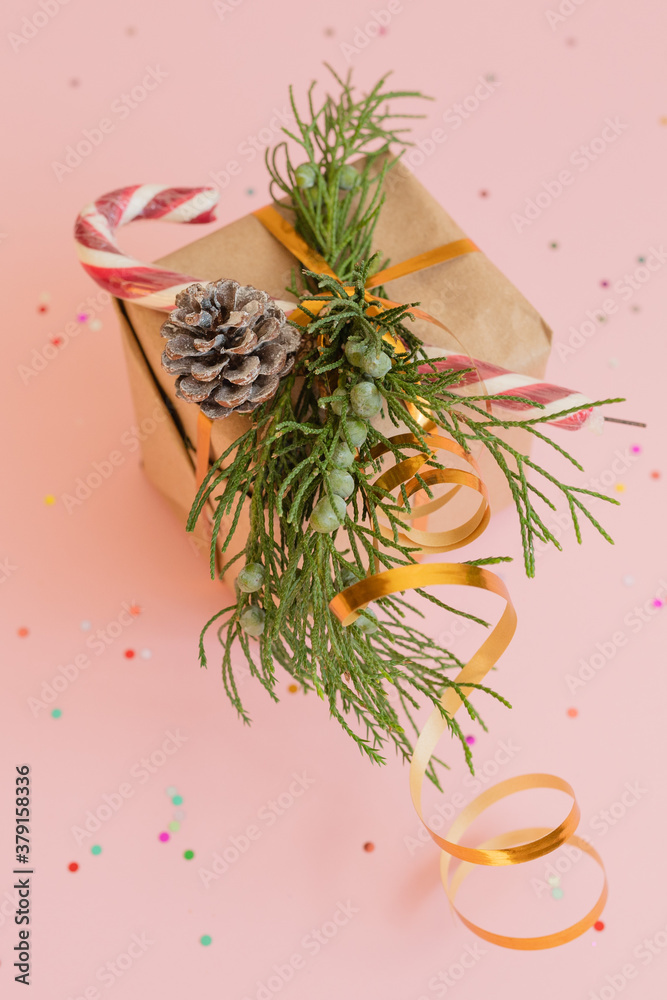 christmas gift in kraft paper with fir branch and lollipop on pink background with multicolored candy with place for text christmas concept