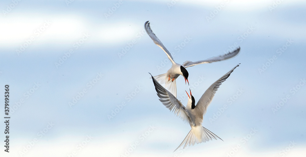 Showdown in the sky. Common Terns interacting in flight. Adult common terns in flight on the blue sky background. Scientific name: Sterna hirundo