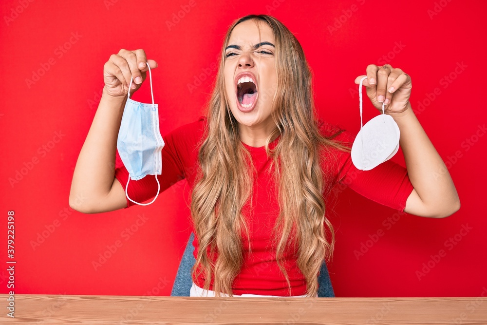Young beautiful blonde woman holding two different safety masks angry and mad screaming frustrated and furious, shouting with anger. rage and aggressive concept.