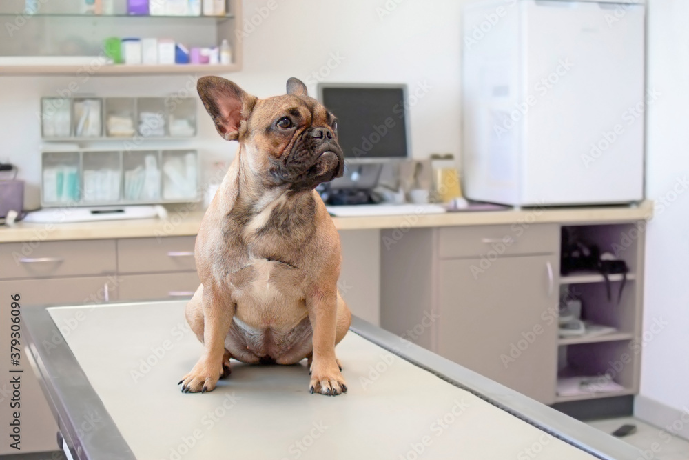 Dog at vet, young female French Bulldog sitting on examination table at veterinary practice clinic