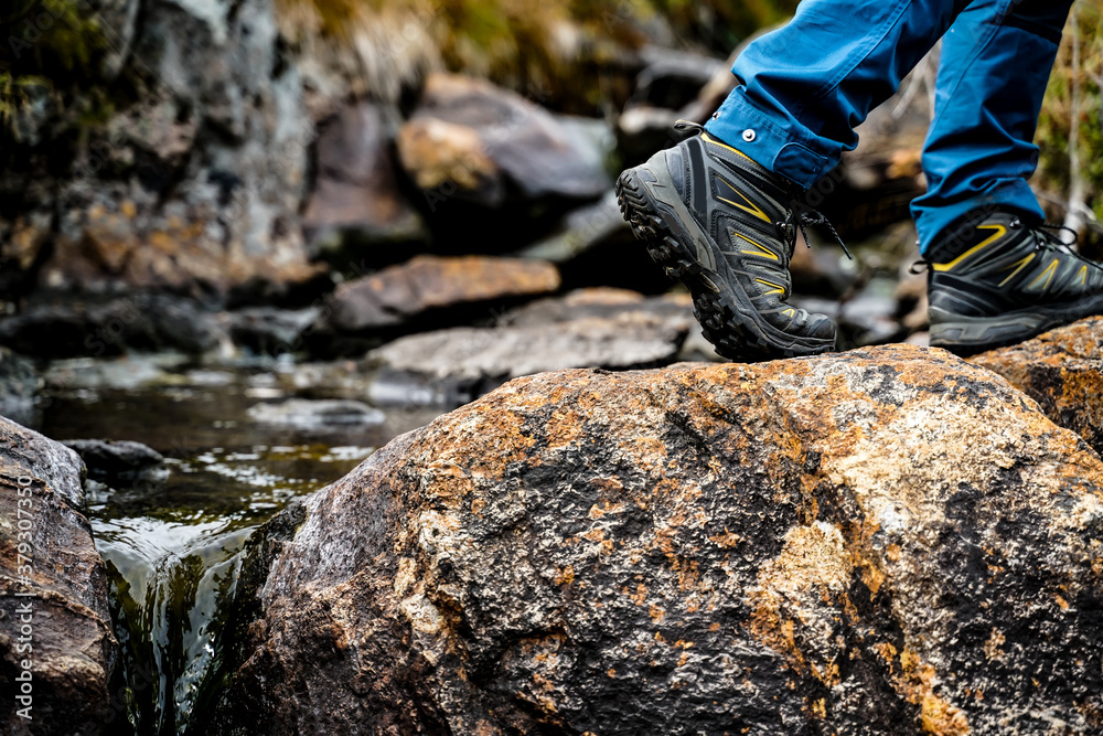 Boots on a hiker, walking on large rocks while crossing a stream in the wild. Close up.