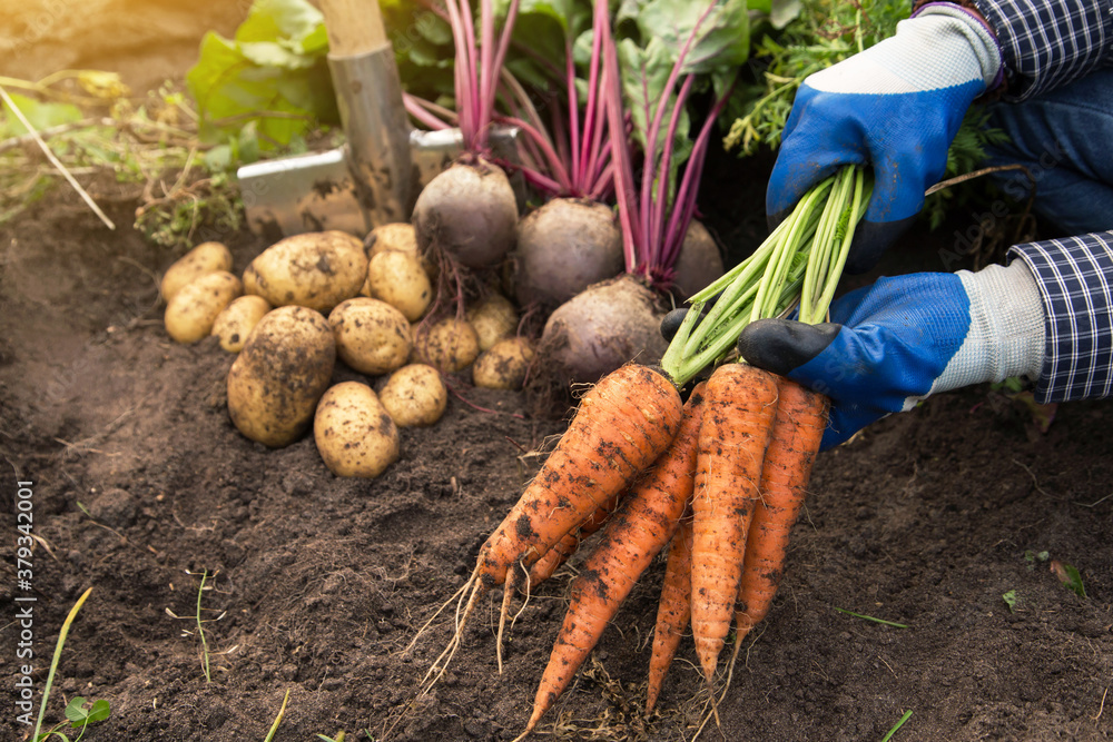 Harvesting organic vegetables. Autumn harvest of fresh raw carrot in farmer hands in garden