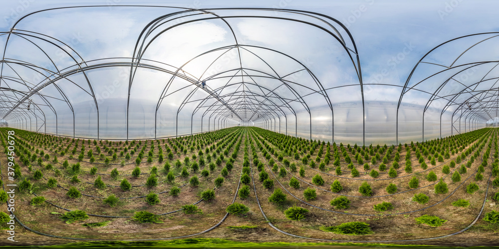 full seamless spherical hdri panorama 360 degrees angle view inside of greenhouse of young conifers with a lot of plants in equirectangular projection. VR AR content