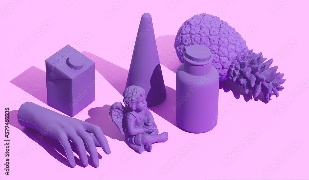 Minimal abstract composition in isometric. Still life. Purple background and objects. Violet geometric mood