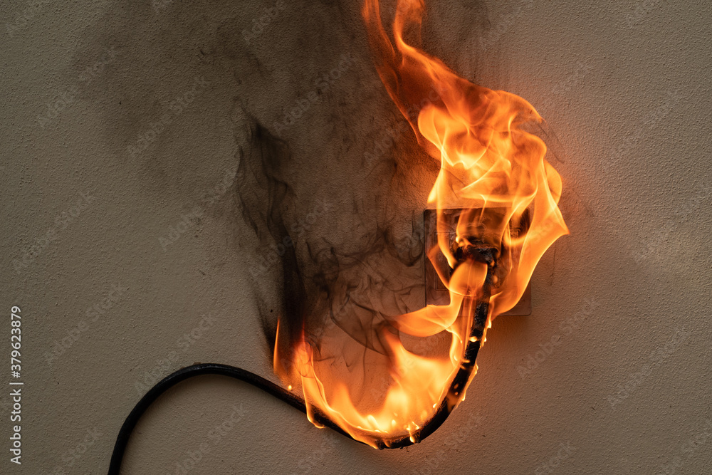 On fire electric wire plug Receptacle on the concrete wall exposed concrete background with copy space