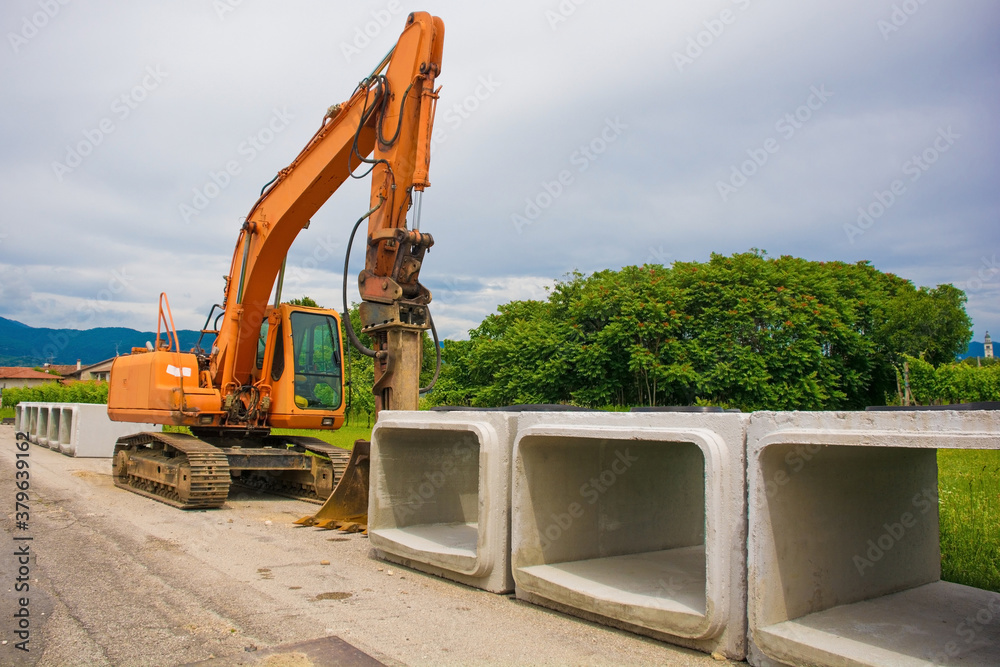 A crawler excavator with a rotating house platform and continuous caterpillar track with some reinforced concrete box culverts. On the site of a sewage system replacement scheme in north west Italy