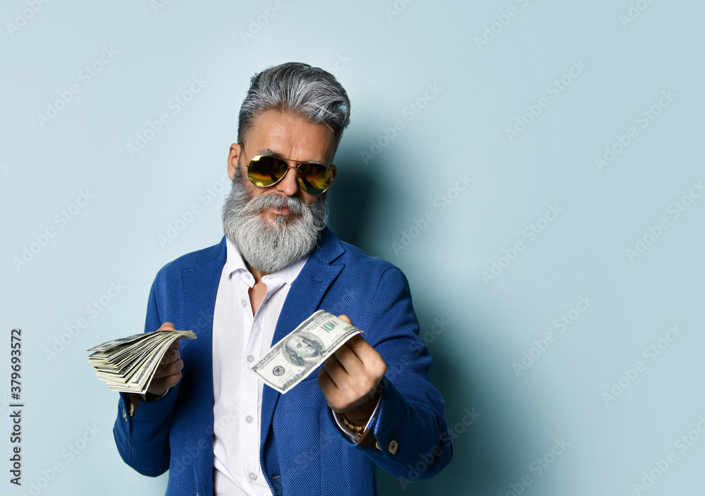 Gray-haired male in white shirt, jacket and sunglasses. Smiling, holding some hundred dollar bills, posing on blue background