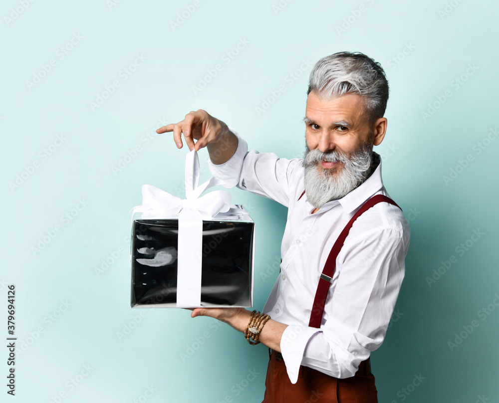 Aged male in white shirt, brown pants and suspenders, bracelet. He holding silver gift box, posing sideways on blue background