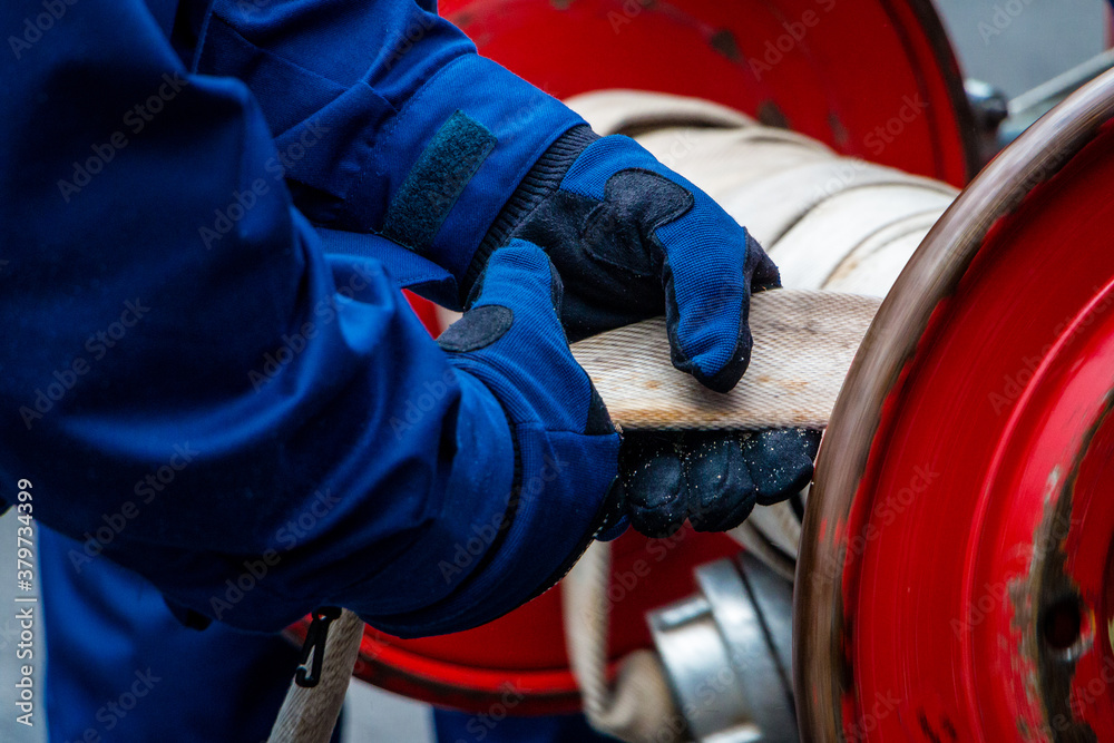 Jugendfeuerwehr beim aufrollen der Schlauchrolle Haspel