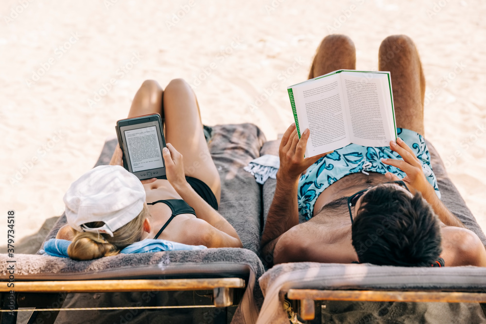 Couple reading ebook and book on beach