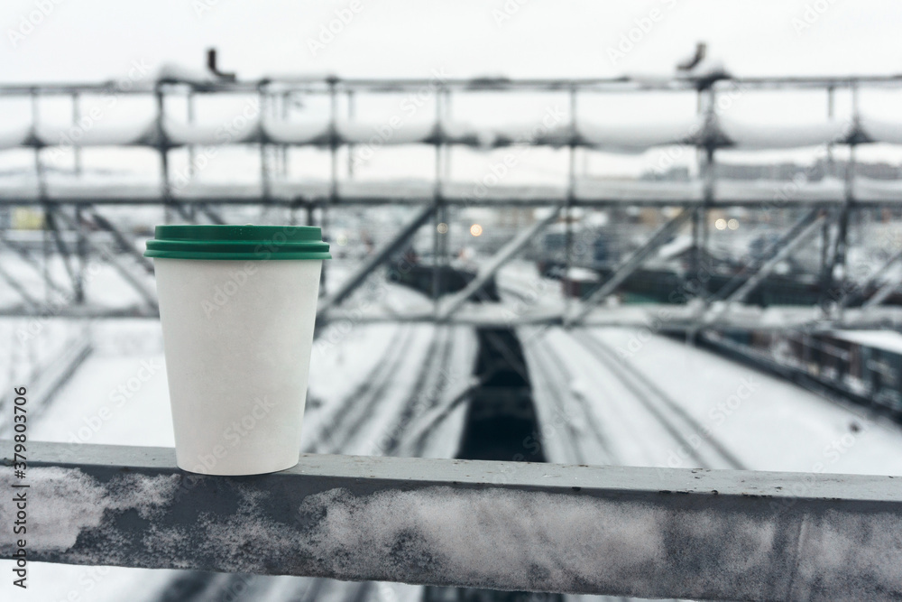 a white cup for hot coffee with a green lid stands on the railing of the bridge over the railway station with dark freight cars on a frosty winter day