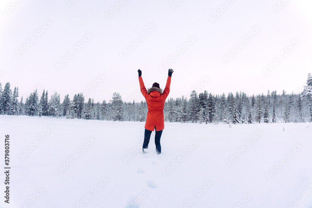 young girl in a bright warm orange jacket jumps from happiness up from a deep snow against a background of a beautiful winter forest