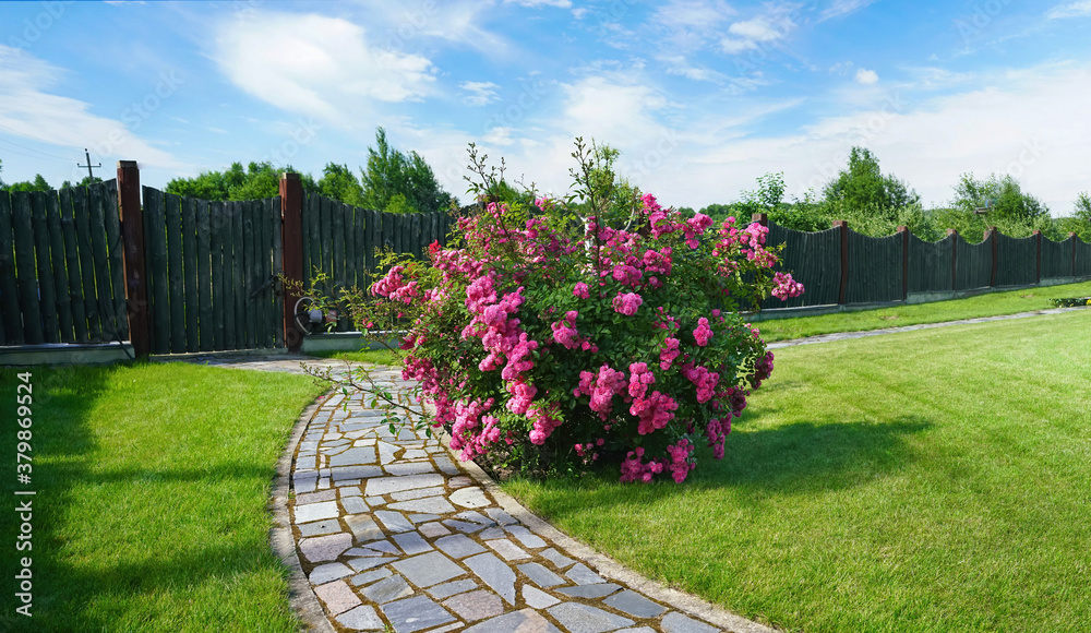 Beautiful manicured green mown lawn on household plot, pink rose Bush varieties Excelsa and stone path Against blue sky with white clouds on Sunny day.