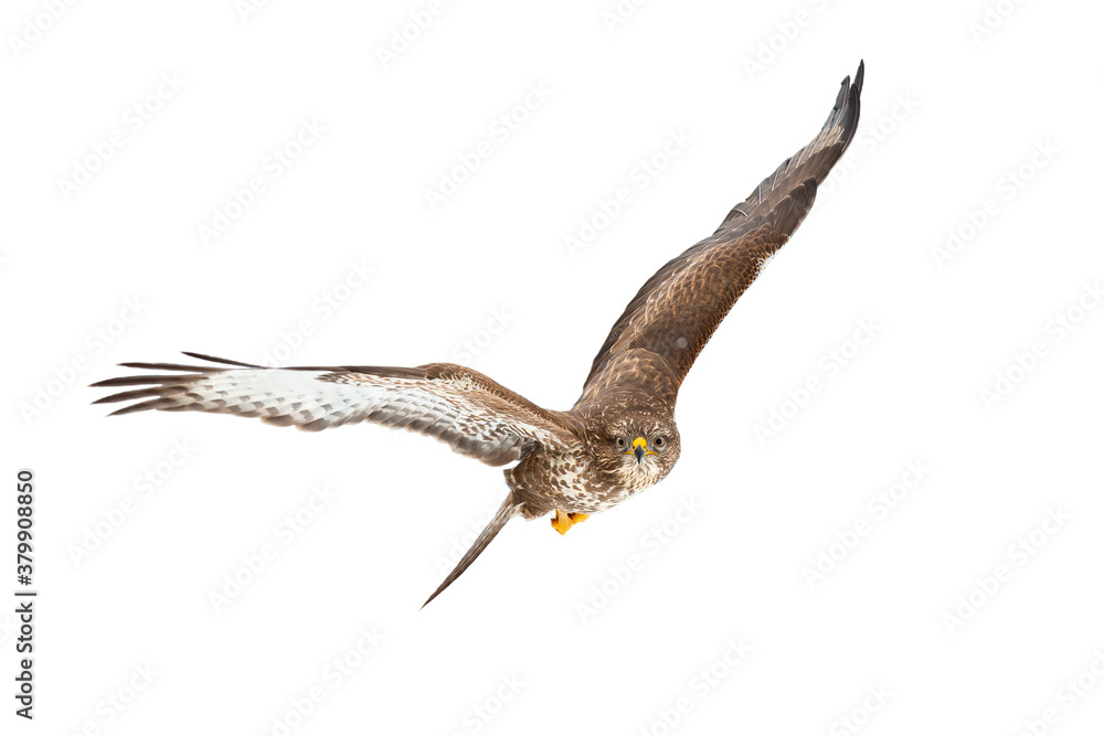 Common buzzard, buteo buteo, flying i the air isolated on white background. Majestic bird of prey spreading wings with copy space. Impressive brown animal in flight cut out on blank.