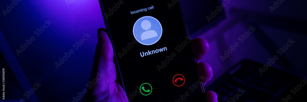 Homem segurando celular recebendo chamada desconhecida - Fundo com a tela do computador e luz neon azul com lilás