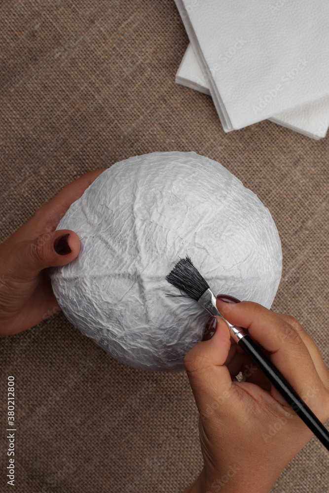 making homemade crafts - pumpkin for Halloween from papier-mache, stick pieces of napkins with a brush, DIY.