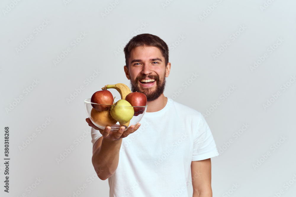 man with fresh fruit in a glass cup gesturing with hands vitamins health energy model bushy beard mustache