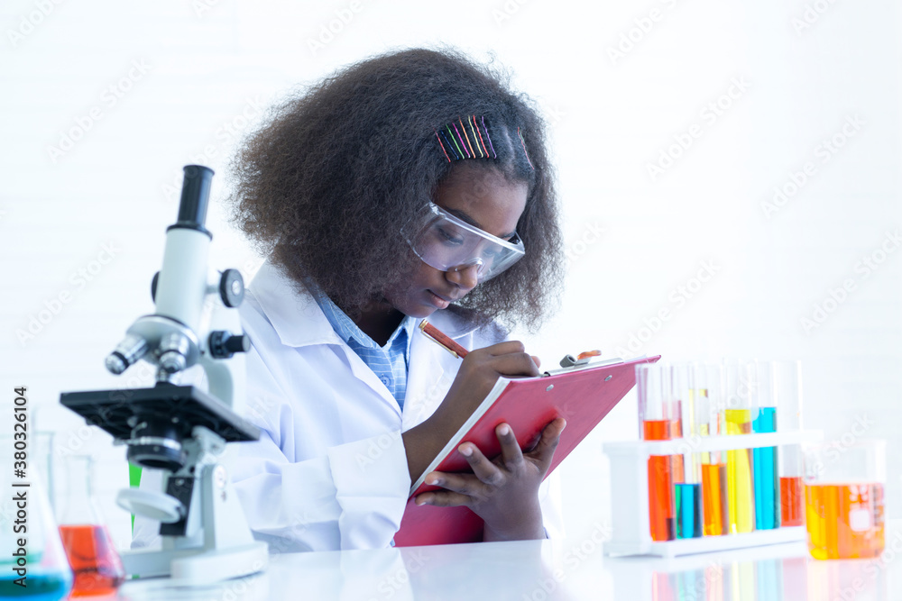 Dark teenage girls study chemistry at the lab, write something on the clipboard