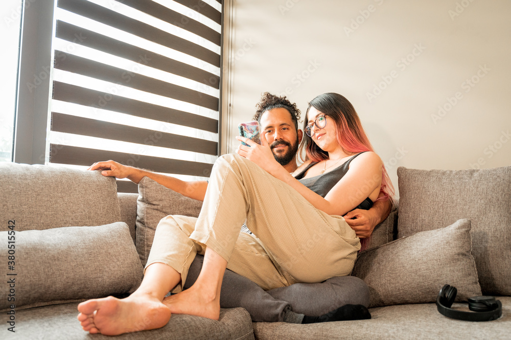 Joven pareja mexicana pasan tiempo juntos en sillon dentro de casa utilizando un telefono inteligente