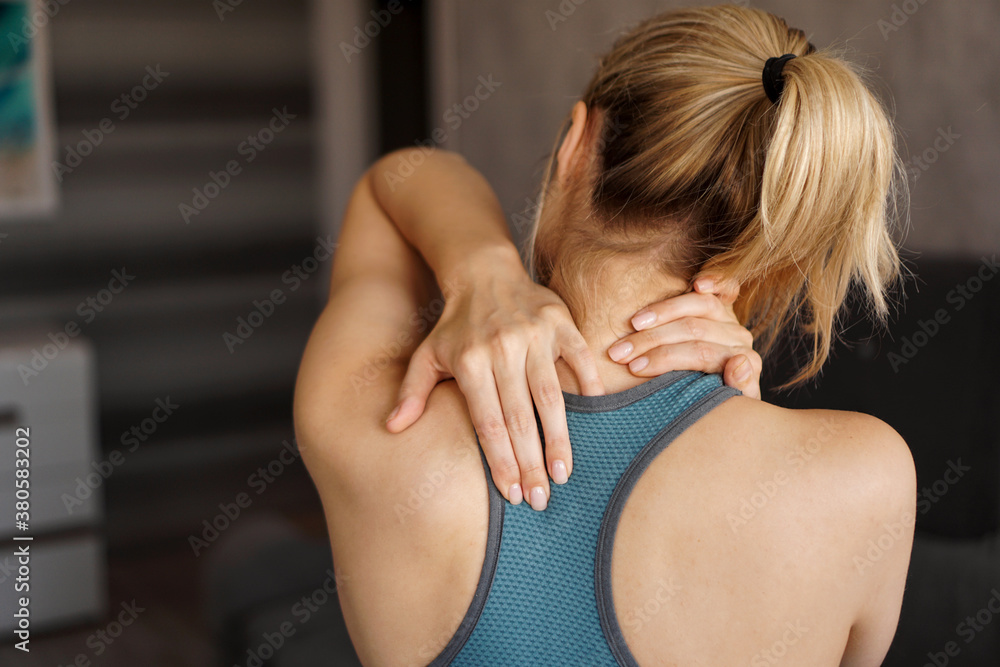 Sports injury concept. Athletic girl feeling pain in her neck against blurred background. Pain after home workout