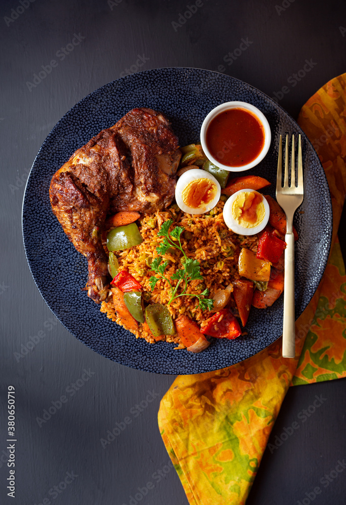 West African entree of Jollof rice, chicken, boiled egg, vegetables with Shito sauce with copy space