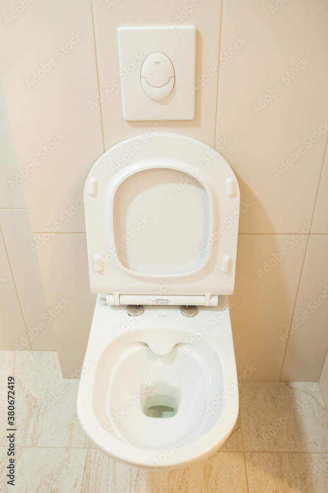 Toilet, white wall-hung toilet, rimless toilet on the walls, beige tiles. renovation in the apartment. View from above.