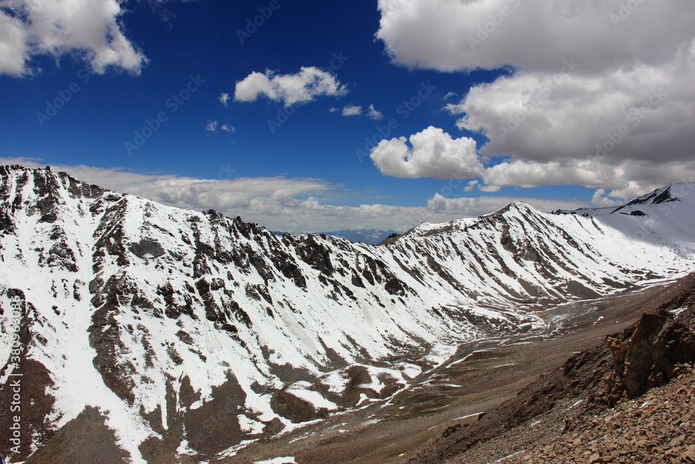 Ladakh, Mountains, Passes, beautiful blue sky with clouds, India, snow capped Himalayas