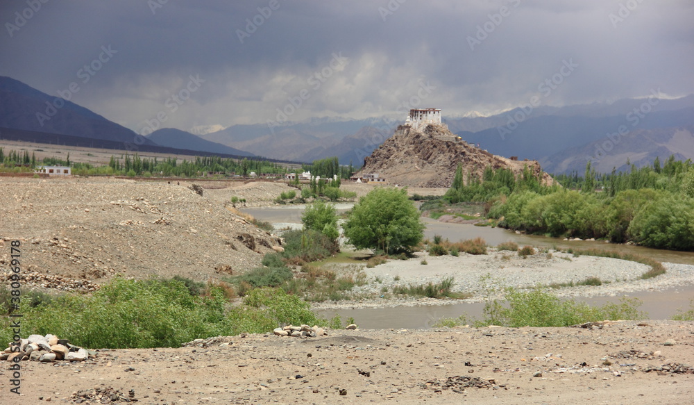 Monasteries and stupas in Leh, Buddhist place of worship, Himalyas and mountains amid beautiful blue sky, Ladakh, India