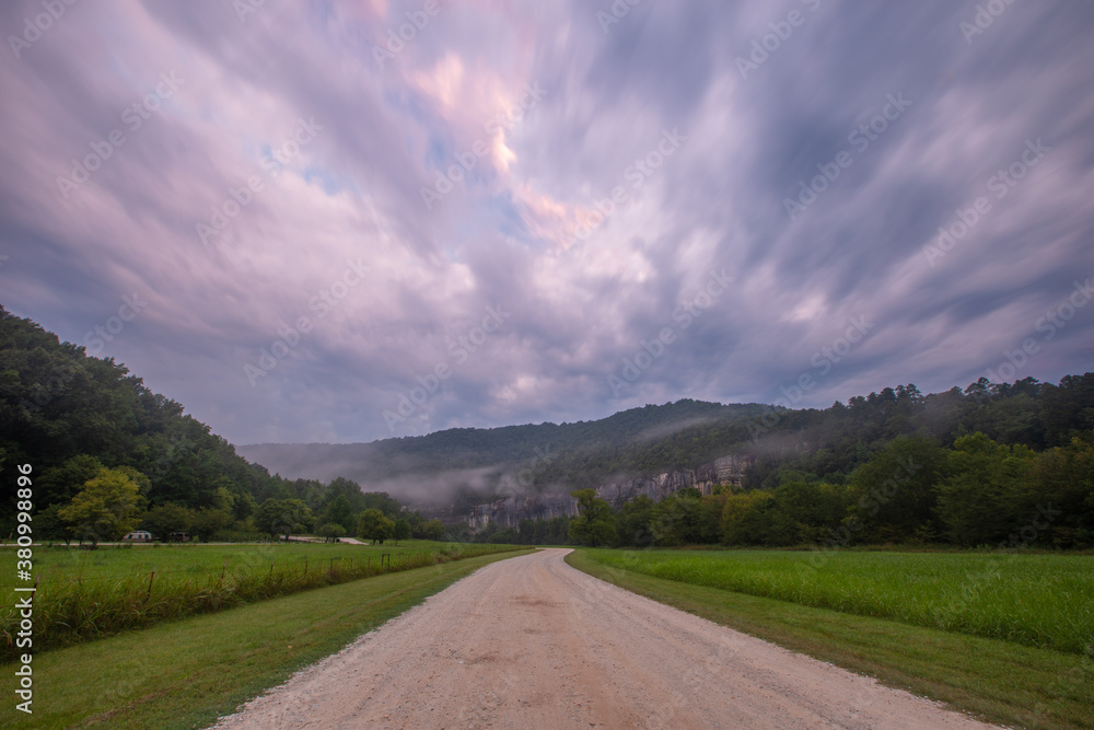 Dirt road through mountains and forest on a cloudy foggy day between grass fields