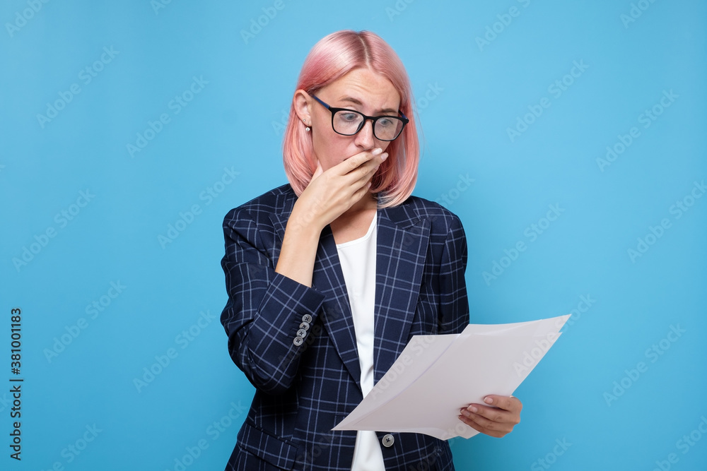 Shocked, funny looking business woman, can not believe her eyes reading financial documents