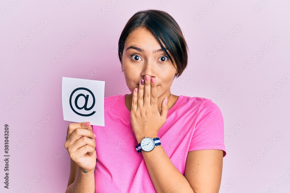 Beautiful young woman with short hair holding paper with email symbol covering mouth with hand, shocked and afraid for mistake. surprised expression
