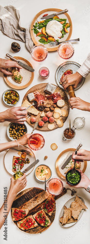 Family wine and snack party. Flay-lay of peoples hands eating and drinking rose wine over table with cheese, fruit, smoked meat, tomato brushettas, buratta salad, top view. Wine tasting concept