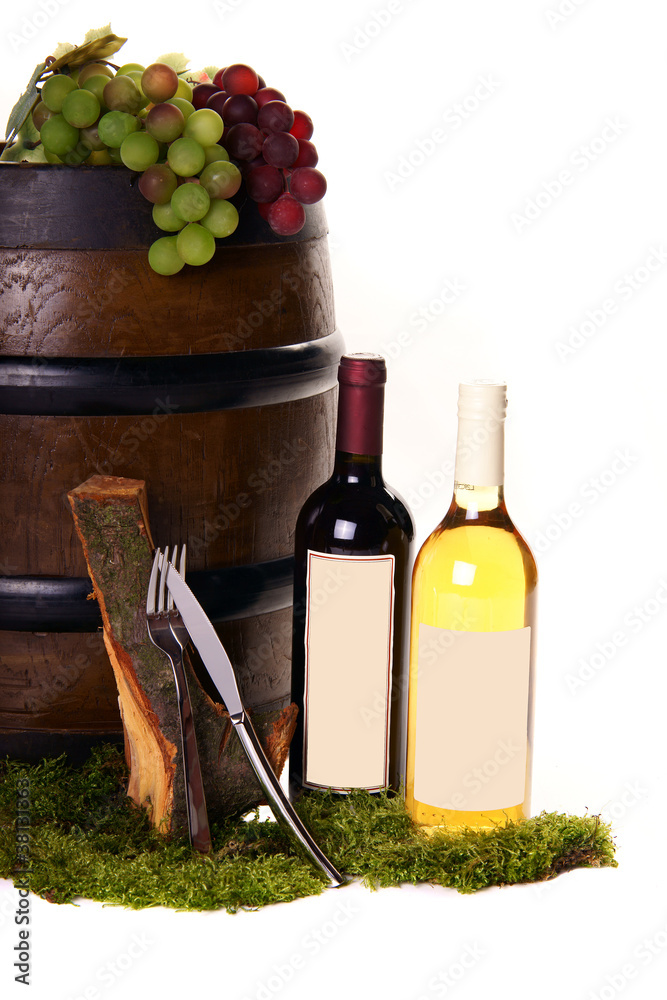 Weinflasche wein rotwein antik fass trauben messer gabel