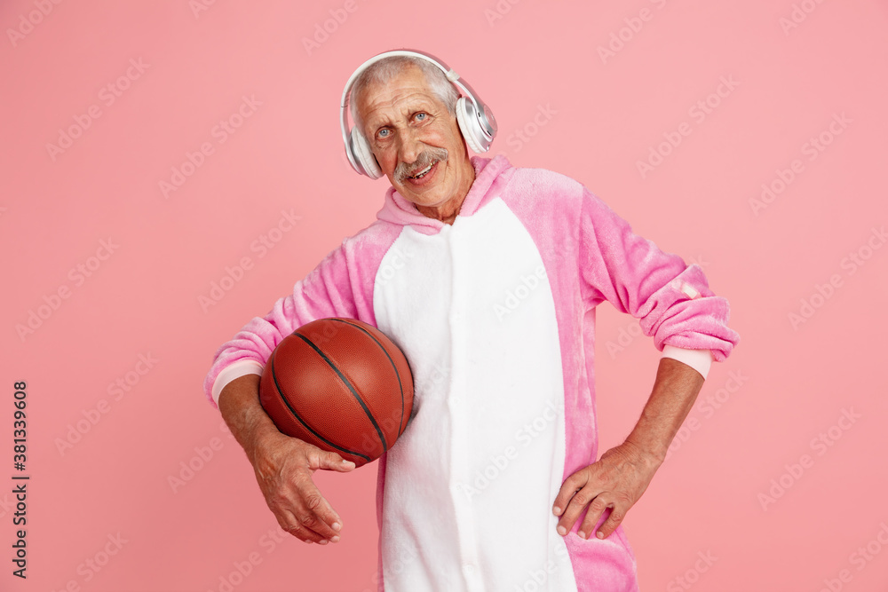 Posing with ball and headphones. Portrait of senior hipster man in stylish attire isolated on pink studio background. Tech and joyful elderly lifestyle concept. Trendy colors, forever youth. Copyspace