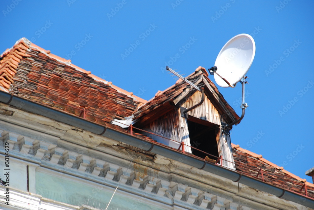 Old roof with dormer and satellite dish
