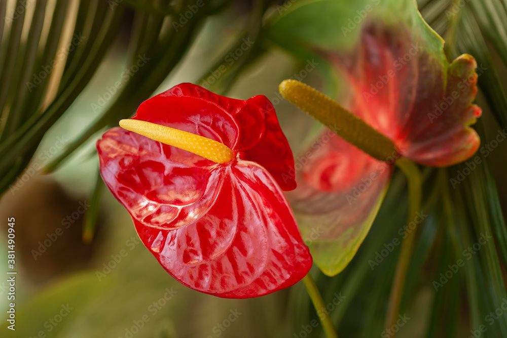 Anthurium. Red flamingo lily, tropical exotic plant