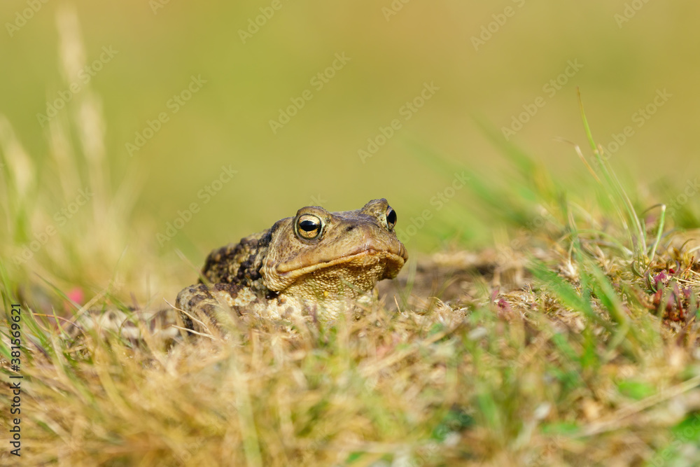 Common Toad (Bufo bufo) walking over a grassy mound, taken in London, England