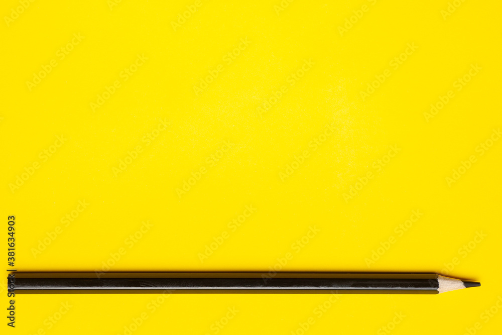 horizontal black sharp wooden pencil on a bright yellow background, isolated, copy space, mock up.