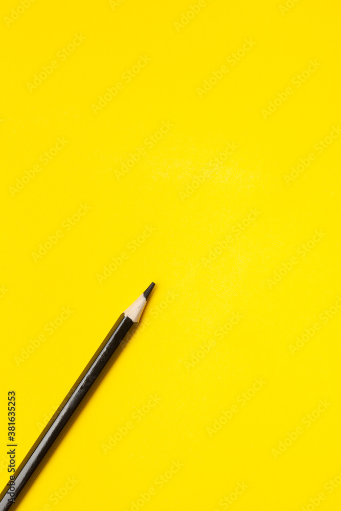 diagonal black sharp wooden pencil on a bright yellow background, isolated, copy space, mock up.