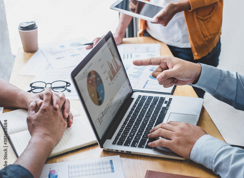 Business team collaboration discussing working analyzing with financial data and marketing growth report graph in team, presentation and brainstorming to strategy planning making profit of company