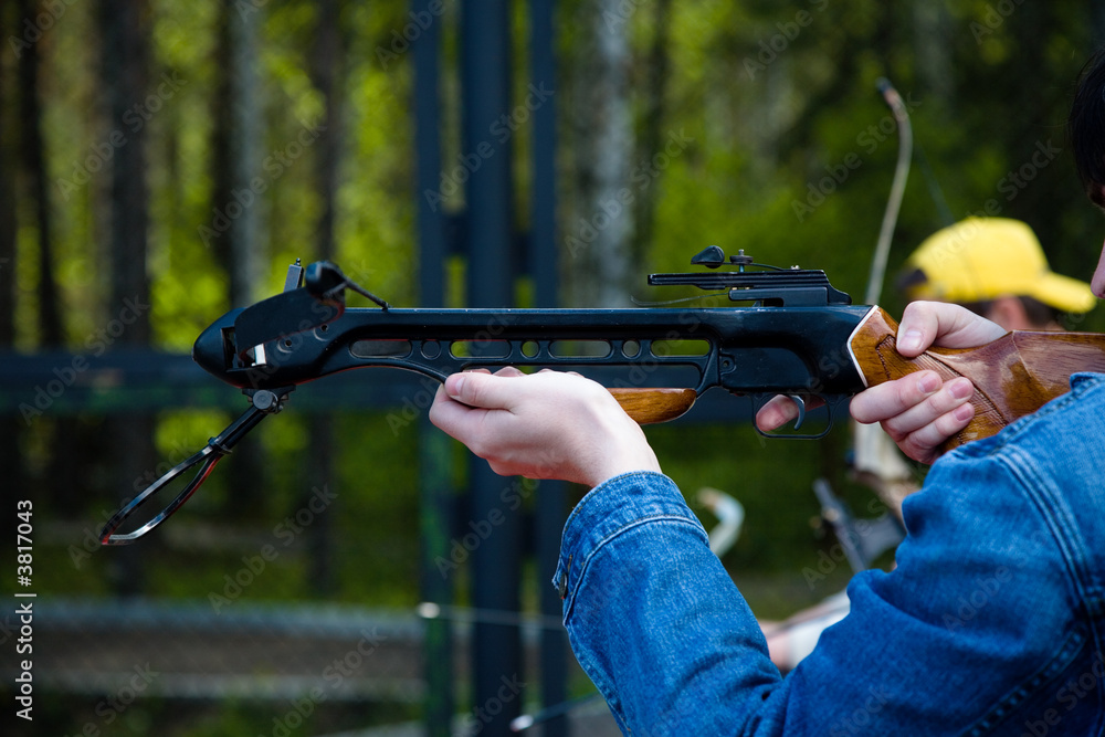 Men crossbow shooting