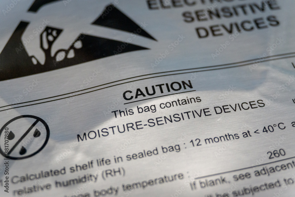 Close-up of moisture barrier bag caution warning label from electronics manufacturing industry